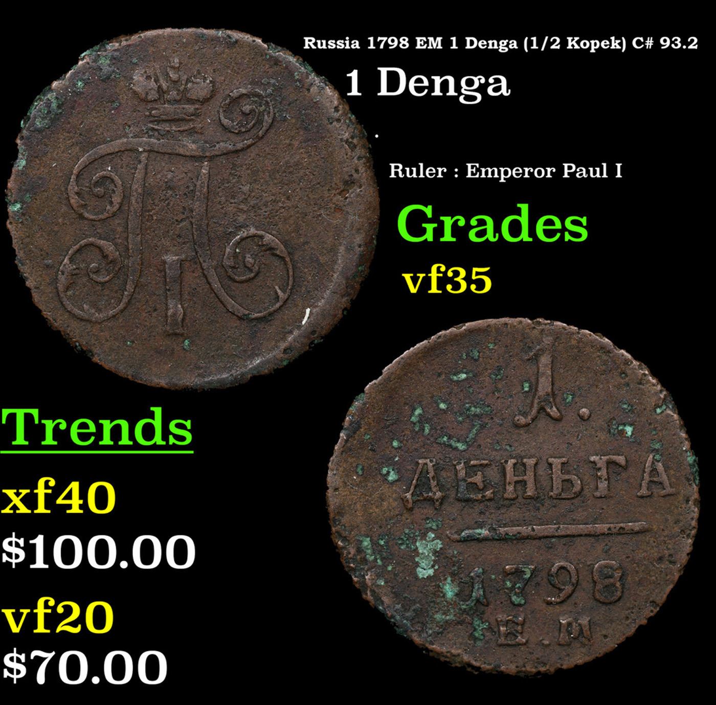 Russia 1798 EM 1 Denga (1/2 Kopek) C# 93.2 Grades vf++. The word Denga means 1/2 a Kopeck. About the Kopek, 100 Kopeks make 1 Ruble. To give an idea of the purchasing power of one of these in the 1790's one could purchase 50 apples for a Kopek, so these kopek pieces did have some nice buying power.The mintmarks available on these coins are:AM AnnenskEM EkaterinburgKM KolyvanMM MoscowCM Sestroretsk, Finland??? St. PetersburgTM Feodesia, CrimeaIn addition there a few years that pieces with no mint mark can be found.