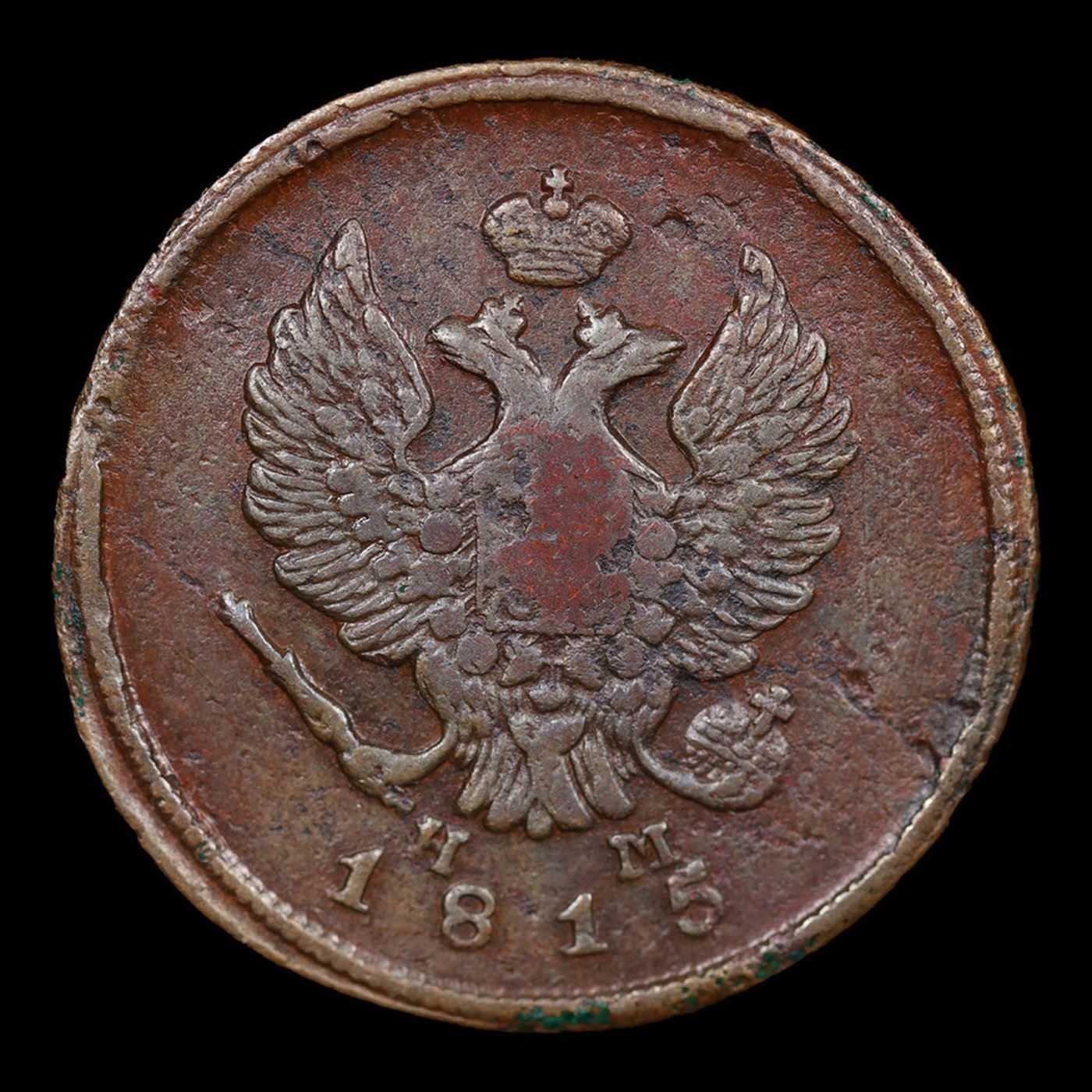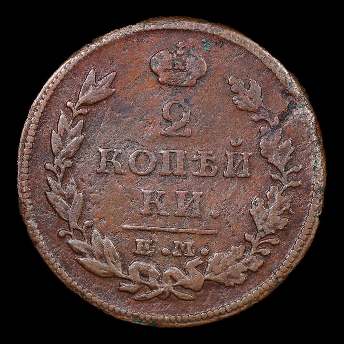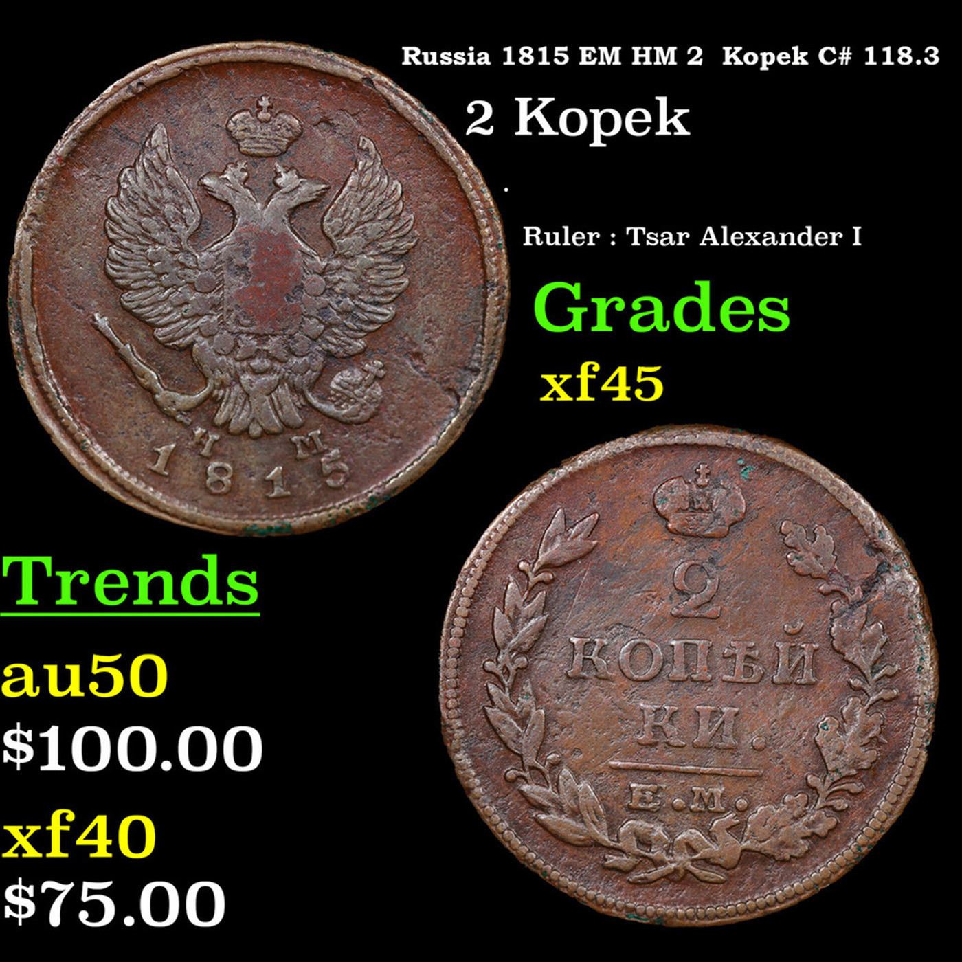 Russia 1815 EM HM 2 Kopek C# 118.3 Grades xf+. About the Kopek, 100 Kopeks make 1 Ruble. To give an idea of the purchasing power of one of these in the 1790's one could purchase 50 apples for a Kopek, so these kopek pieces did have some nice buying power.The mintmarks available on these coins are:AM AnnenskEM EkaterinburgKM KolyvanMM MoscowCM Sestroretsk, Finland??? St. PetersburgTM Feodesia, CrimeaIn addition there a few years that pieces with no mint mark can be found.