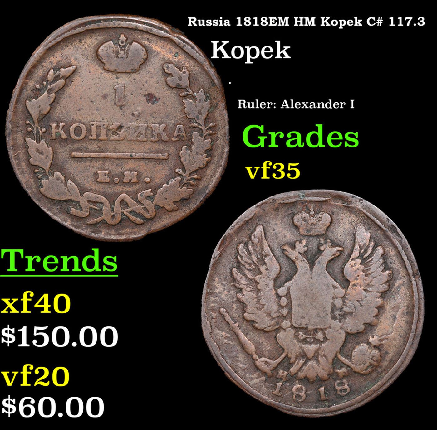 Russia 1818?? ?? Kopek C# 117.3 Grades vf++. About the Kopek, 100 Kopeks make 1 Ruble. To give an idea of the purchasing power of one of these in the 1790's one could purchase 50 apples for a Kopek, so these kopek pieces did have some nice buying power.The mintmarks available on these coins are:AM AnnenskEM EkaterinburgKM KolyvanMM MoscowCM Sestroretsk, Finland??? St. PetersburgTM Feodesia, CrimeaIn addition there a few years that pieces with no mint mark can be found.