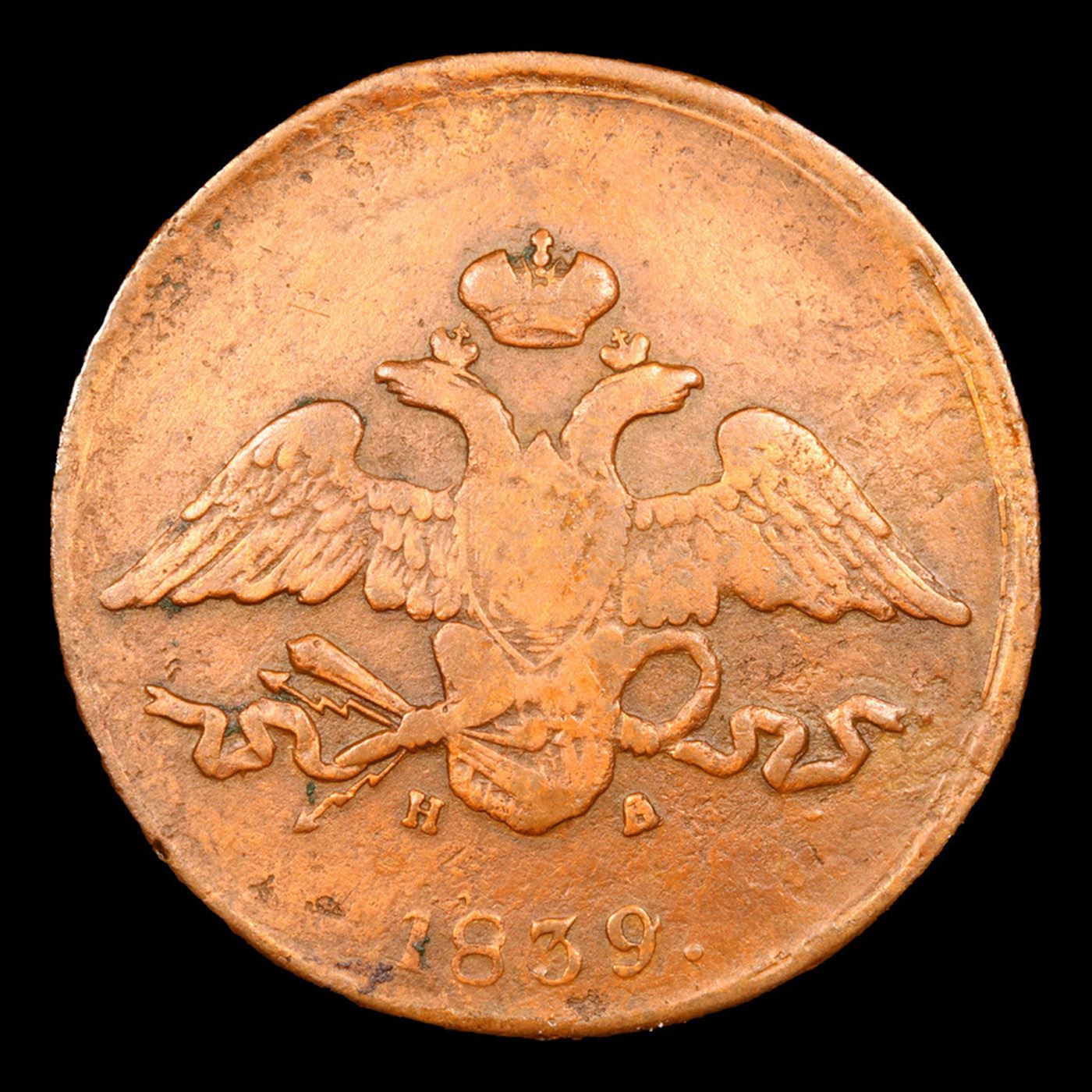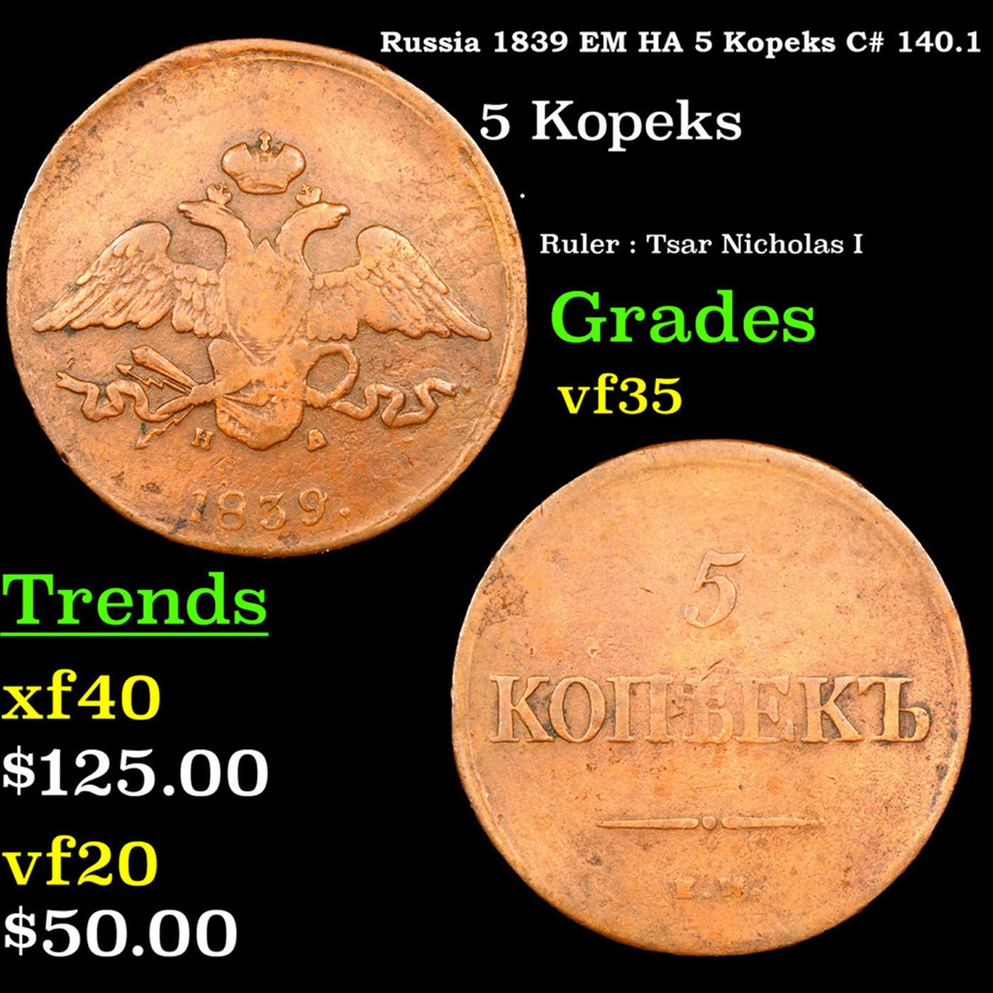 Russia 1839 EM HA 5 Kopeks C# 140.1 Grades vf++. About the Kopek, 100 Kopeks make 1 Ruble. To give an idea of the purchasing power of one of these in the 1790's one could purchase 50 apples for a Kopek, so these kopek pieces did have some nice buying power.The mintmarks available on these coins are:AM AnnenskEM EkaterinburgKM KolyvanMM MoscowCM Sestroretsk, Finland??? St. PetersburgTM Feodesia, CrimeaIn addition there a few years that pieces with no mint mark can be found.