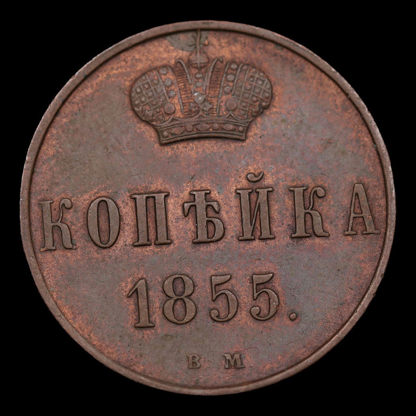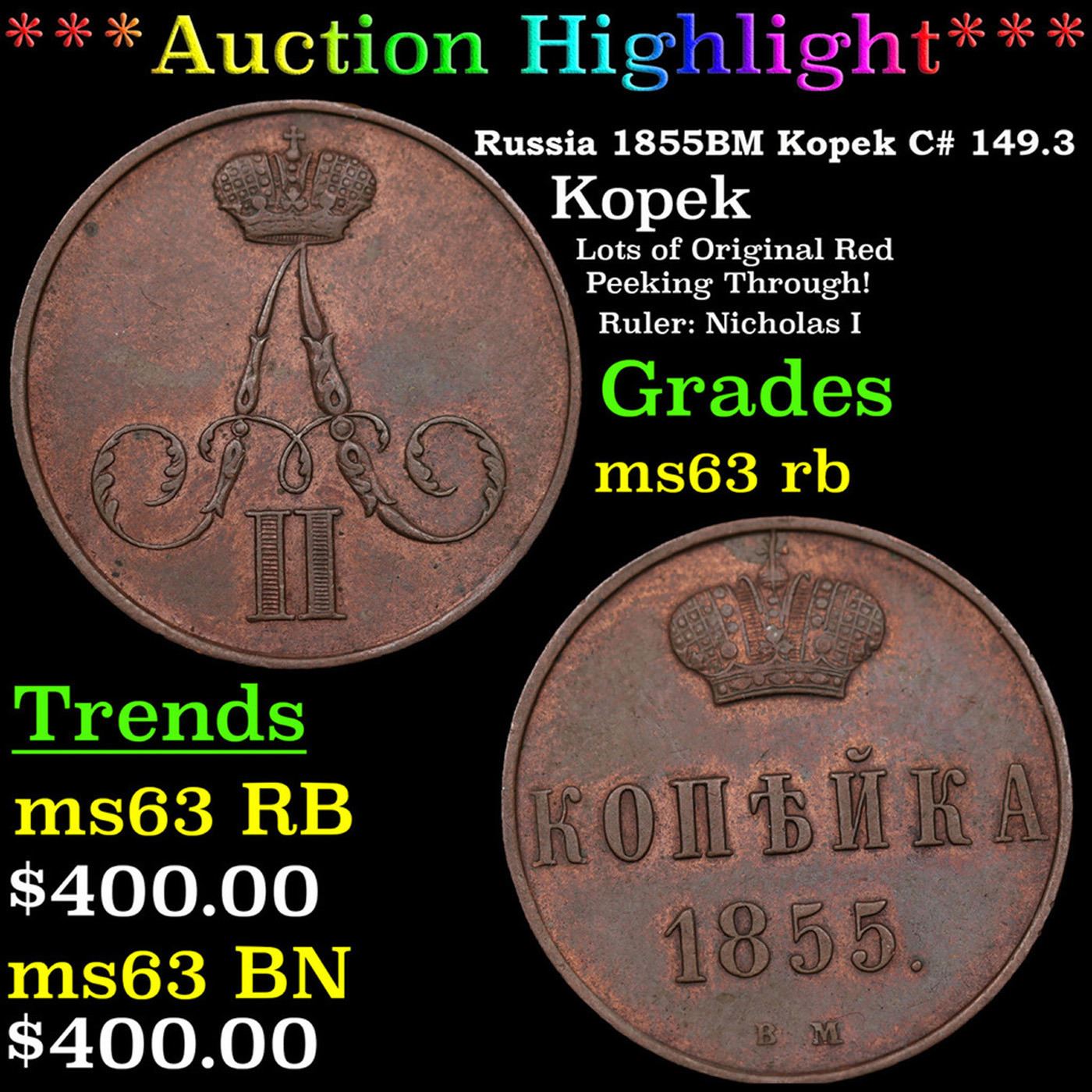 Russia 1855?? Kopek C# 149.3 Grades Select Unc RB. About the Kopek, 100 Kopeks make 1 Ruble. To give an idea of the purchasing power of one of these in the 1790's one could purchase 50 apples for a Kopek, so these kopek pieces did have some nice buying power.The mintmarks available on these coins are:AM AnnenskEM EkaterinburgKM KolyvanMM MoscowCM Sestroretsk, Finland??? St. PetersburgTM Feodesia, CrimeaIn addition there a few years that pieces with no mint mark can be found.
