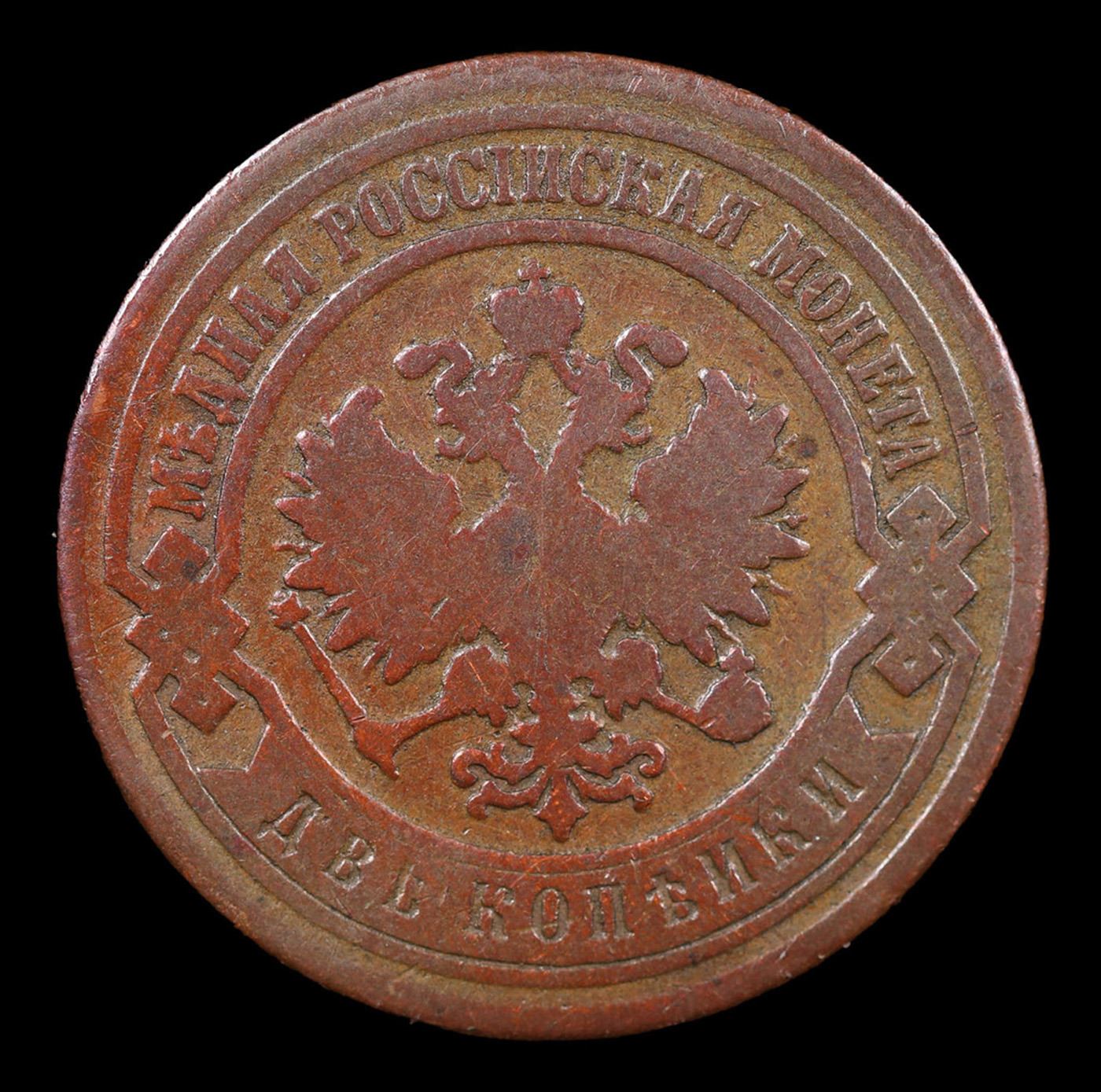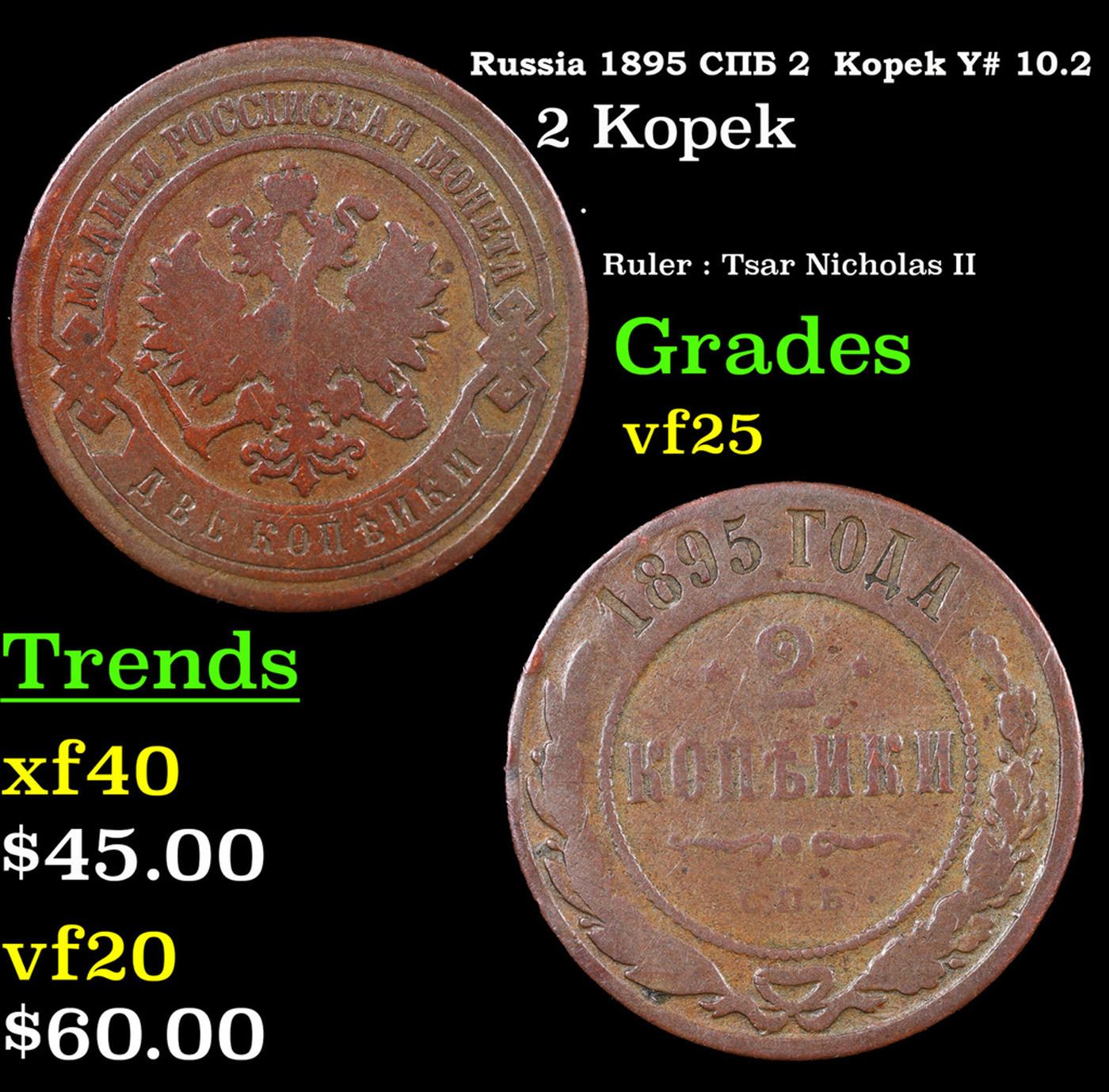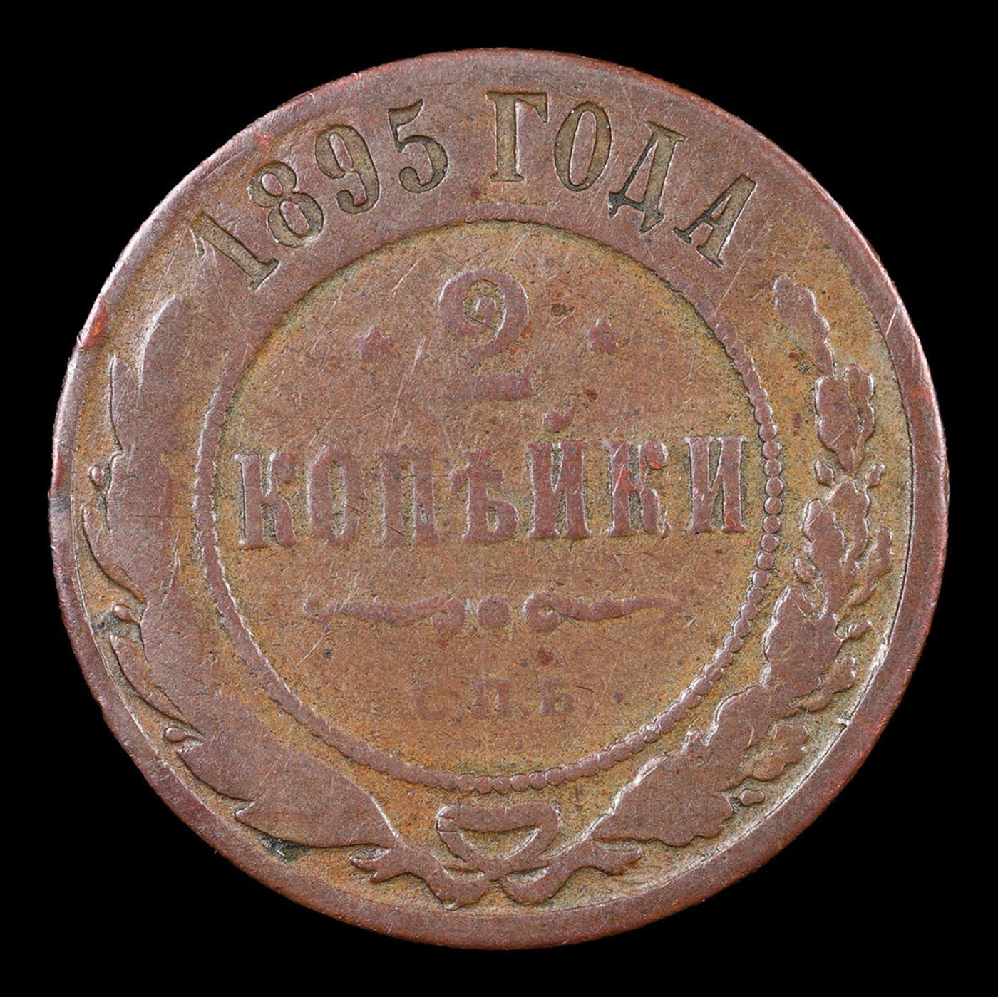 Russia 1895 ??? 2 Kopek Y# 10.2 Grades vf+. About the Kopek, 100 Kopeks make 1 Ruble. To give an idea of the purchasing power of one of these in the 1790's one could purchase 50 apples for a Kopek, so these kopek pieces did have some nice buying power.The mintmarks available on these coins are:AM AnnenskEM EkaterinburgKM KolyvanMM MoscowCM Sestroretsk, Finland??? St. PetersburgTM Feodesia, CrimeaIn addition there a few years that pieces with no mint mark can be found.