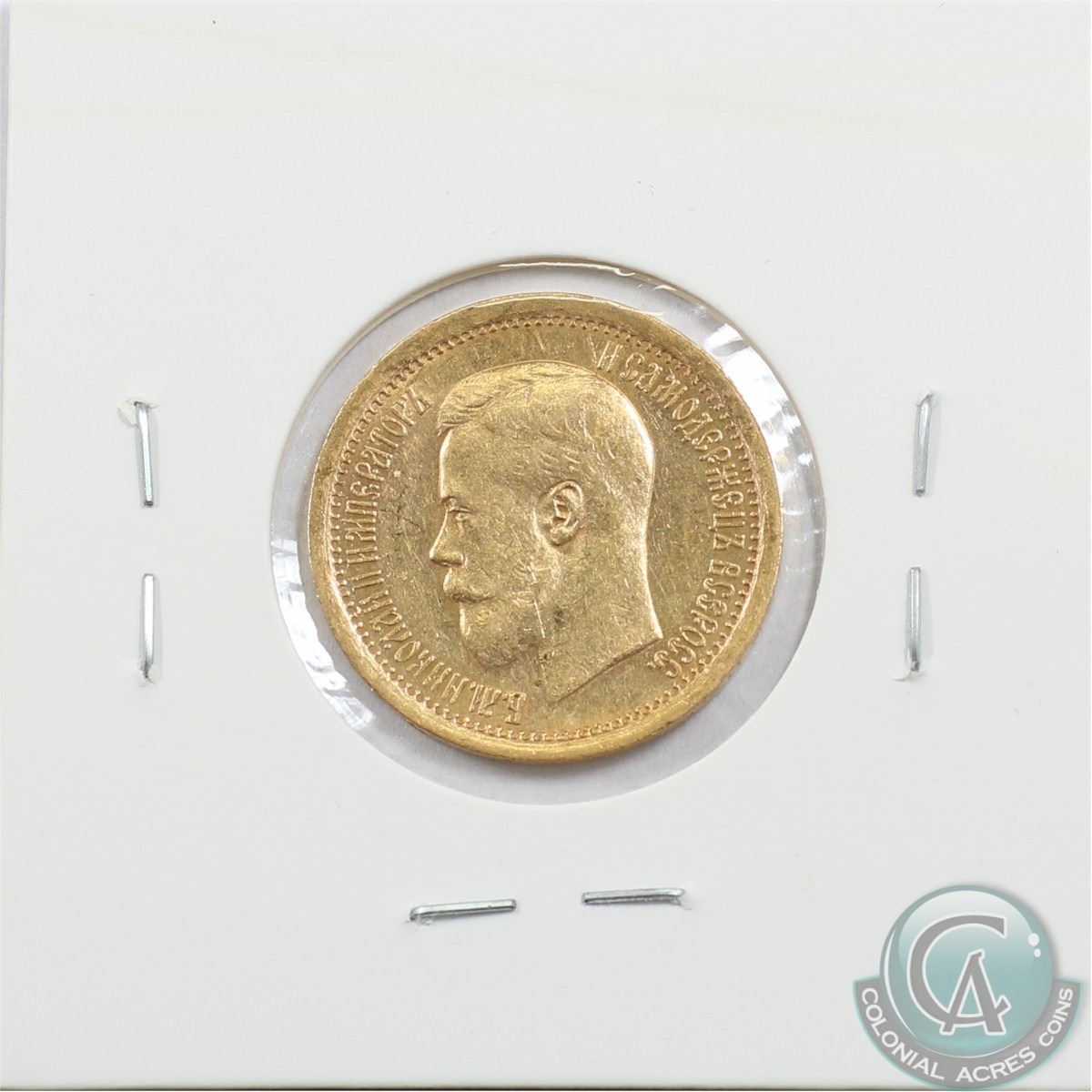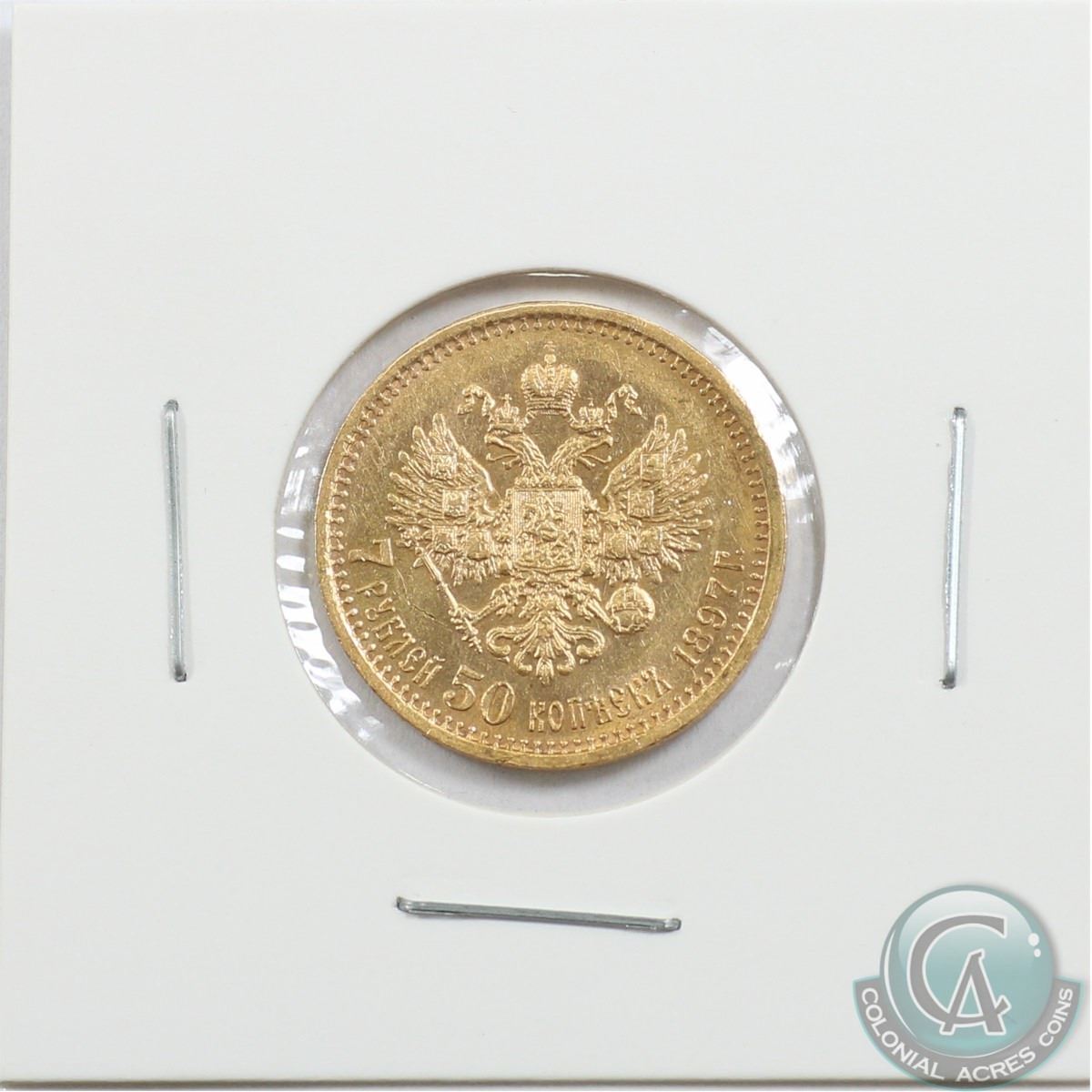 Russia, 1897 Gold 7 Roubles (50 Kopecks) in AU Condition. Coin featured Nicholas II, the last czar of the Russian Empire. Coin is .900 Fine and contains 0.1866oz of pure gold.