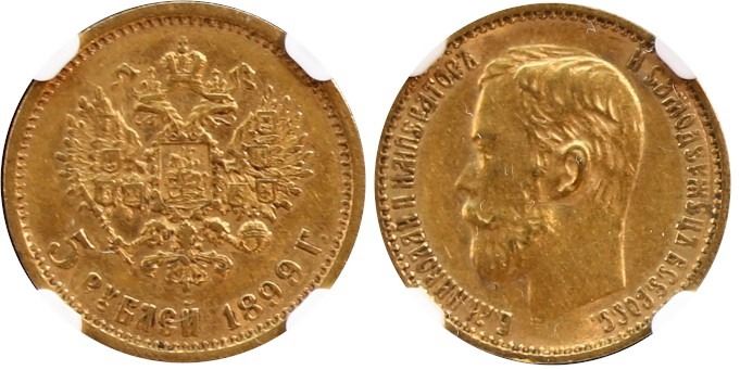 Russia; 1899 5 Roubles - Gold Nicholas II, NGC Choice About Uncirculated-53. 0,124 oz.