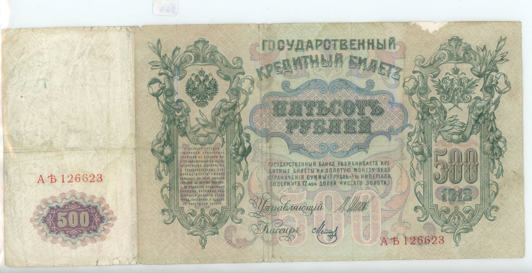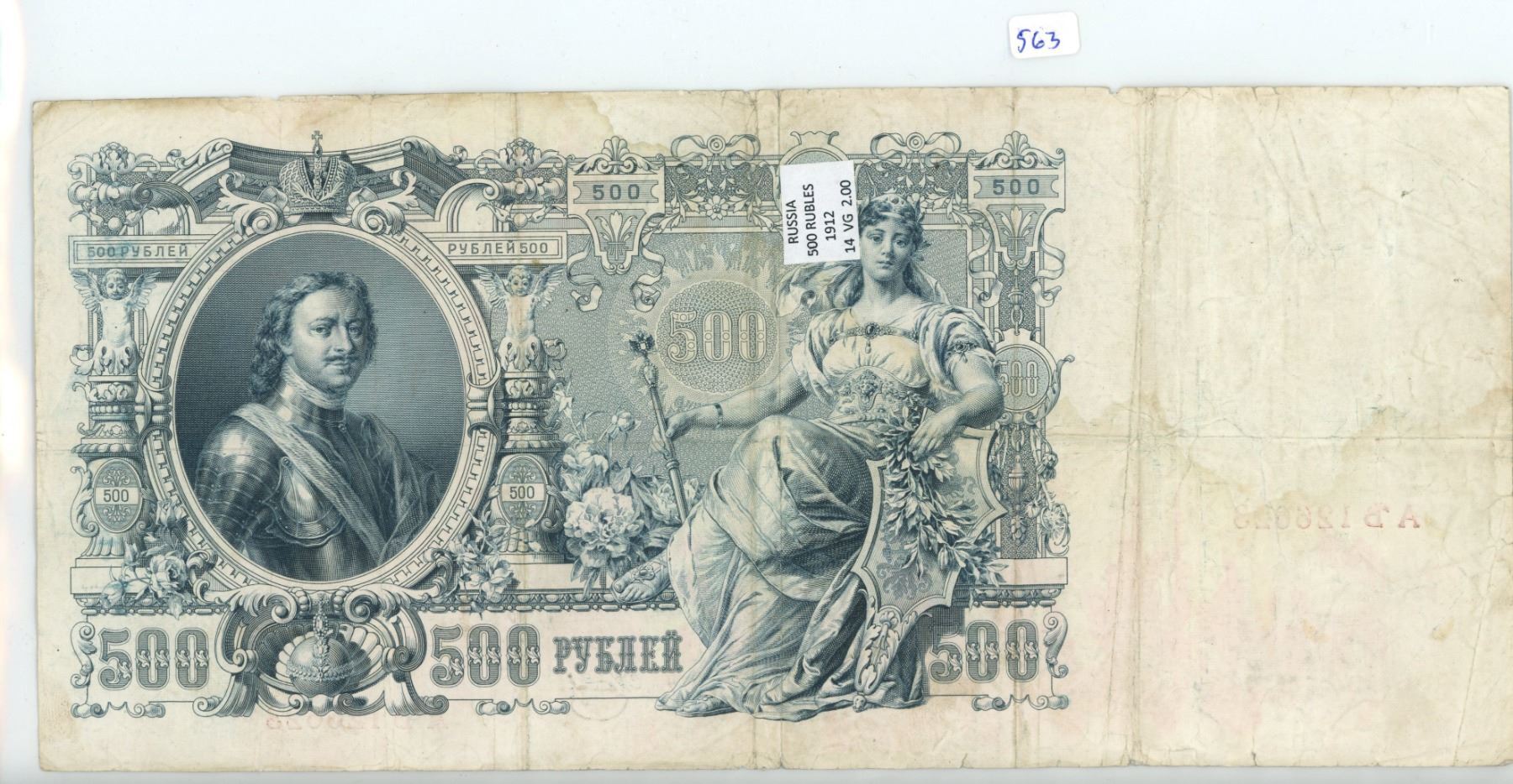 Russia. 1912 500 Rubles note. Massive note measures 11 ¾” X 5”. P-14. Won’t fit in my wallet. Fine or better.
