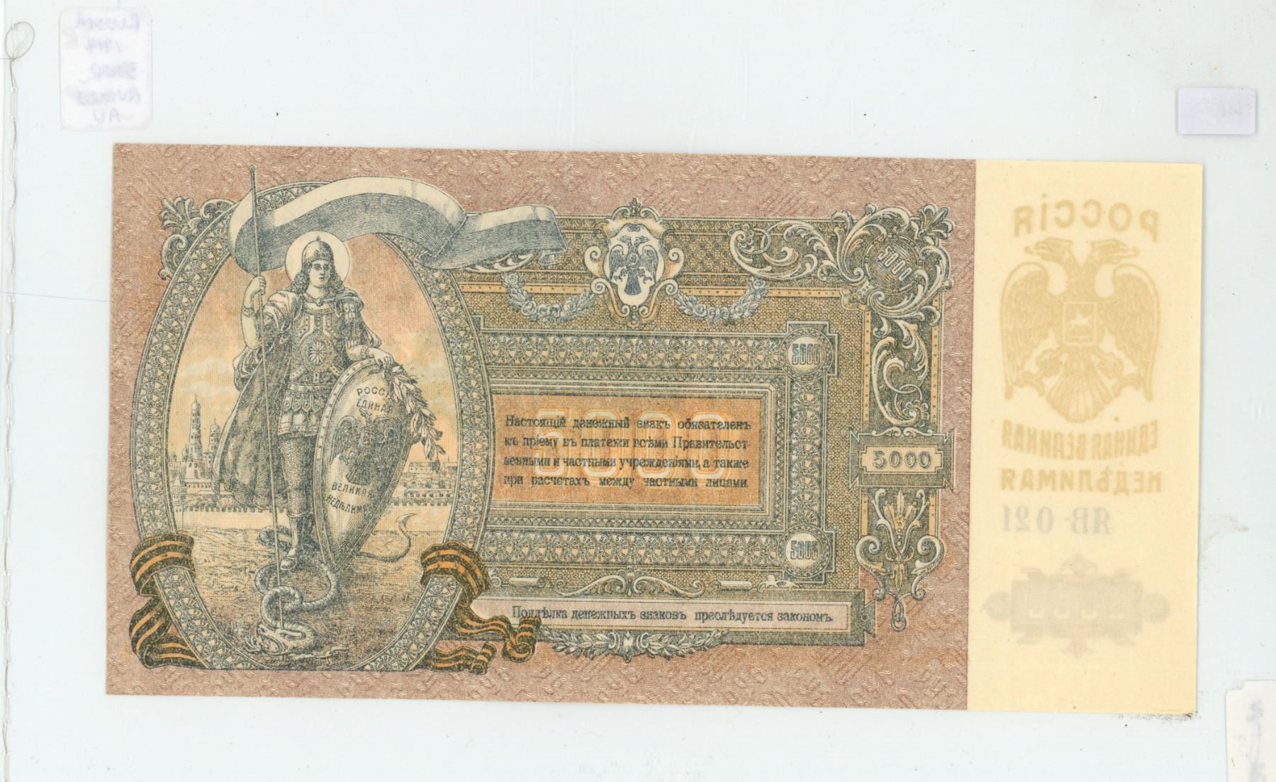 Russia. 1919 5000 Roubles. Massive note measures 9” X 4 ½”. AU.
