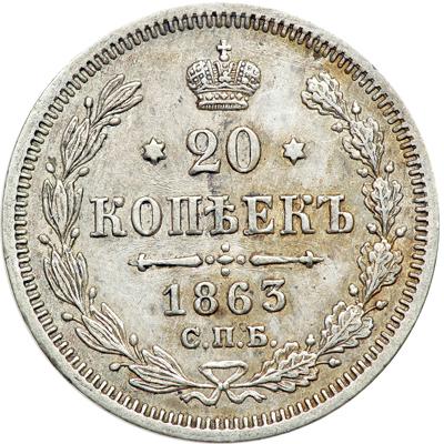 Russia. 20 Kopeks, 1863-SPB AB. Bitkin-209; Sev-3739; KM-Y.22.2. Alexander II. Extremely Fine to About Uncirculated.