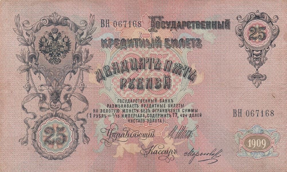 Russia, 25 Ruble, 1909, XF (-), p12br/serial number: BH 067168
