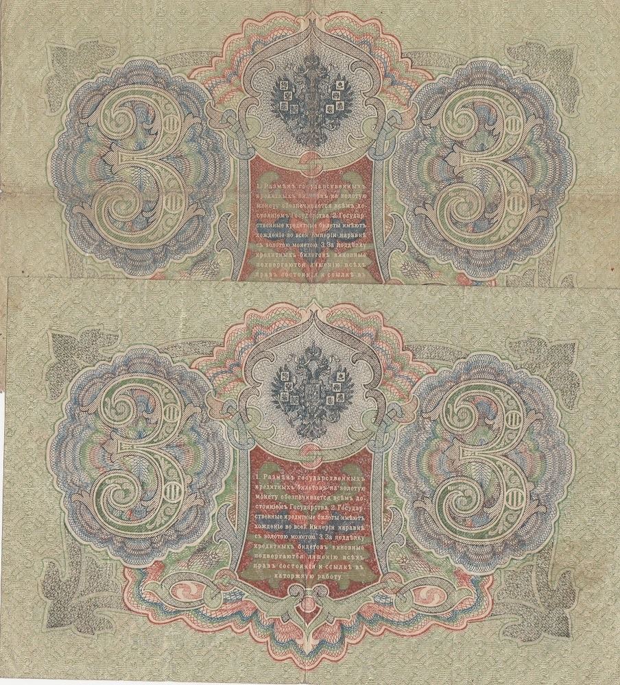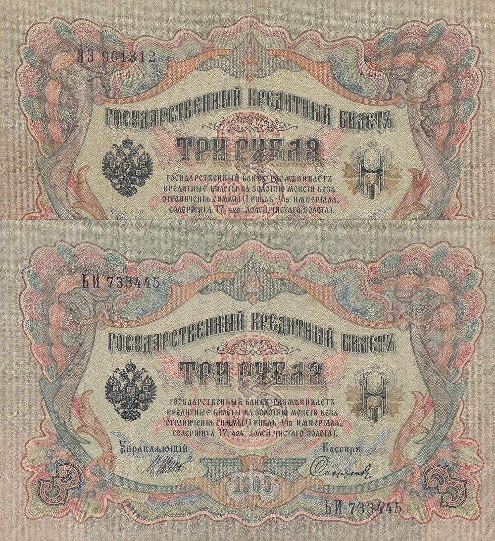 Russia, 3 Ruble, 1905, XF, p9, (Total 2 banknotes)br/serial numbers: 733445 and 961312
