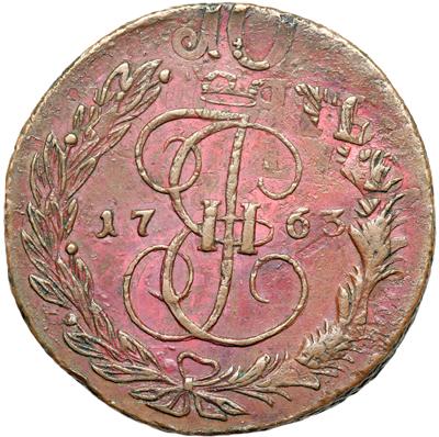 Russia. 5 Kopeks, 1763-MM. B-197; KM-C59.6. Catherine II. Struck over 1762 10 Kopeks. Trace of color. Uncirculated.