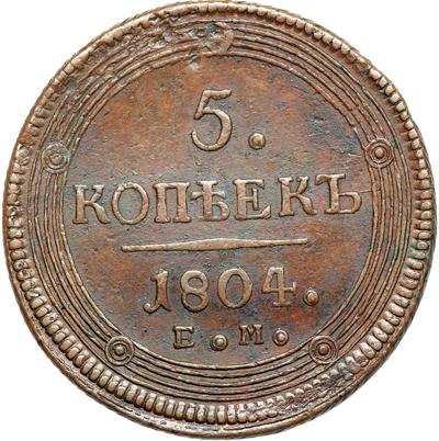 Russia. 5 Kopeks, 1804-YeM. B-116; KM-C115.1. Alexander I. Minor marks. Extremely Fine to About Uncirculated.
