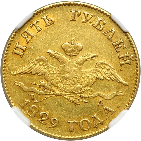 Russia. 5 Roubles, 1829-. Bitkin 1st ed-4; Fr-154; KM-C-174. Nicholas I, 1825-1855. Crowned eagle with wings down. Reverse: Legend in four lines within wreath. NGC graded AU-50.