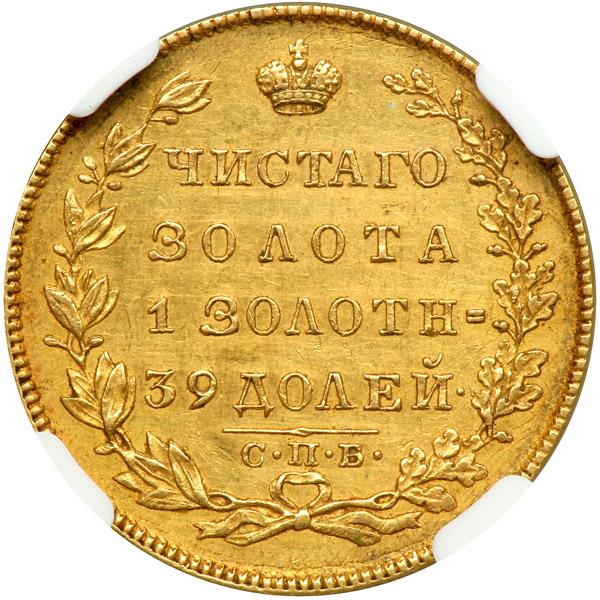 Russia. 5 Roubles, 1831-. Bitkin 1st ed-6; Sev-408; Fr-154; KM-C174. Nicholas I, 1825-1855. Crowned eagle with wings down. Reverse: Crown above legend of four lines within wreath. NGC graded AU-50.