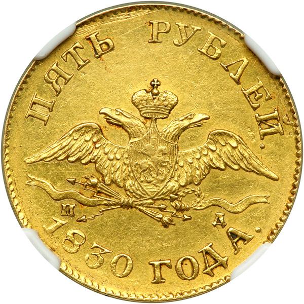 Russia. 5 Rubles, 1830-СПБ ПД. Bitkin 1st ed, 5; Fr-154; Sev-407; KM-C174. Nicholas I. Crowned eagle with wings down. Reverse; Legend within wreath. NGC graded About Uncirculated, Details (Obverse scratched).