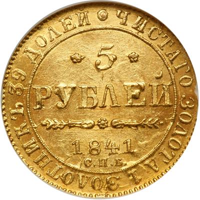 Russia. 5 Rubles, 1841-SPB ACh. Bitkin 1st ed-18; Fr-155; KM-C175.1. Nicholas I, 1825-1855. Eagle. Reverse: Value and date. Very rare condition. NGC graded MS-65.