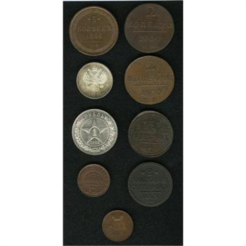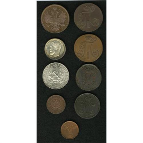 <B>A mixed lot as follows:</B></I> (2) 2 Kopecks 1800 EM, KM-C95.3, XF details with lightly pitted surfaces & XF; 2 Kopecks 1842 EM, KM-C145.1, AU details with light pitting; 2 Kopecks 1843 EM, KM-C145.1, XF details with granular surfaces; 1 Kopeck 1859 BM, KM-Y3.2, XF; 2 Kopecks 1872 EM, KM-Y10.1, AU; 5 Kopecks 1866 EM, KM-Y6a, AU; 50 Kopecks 1913 BC, KM-Y58.2, lightly toned UNC with light contact marks; and a Rouble 1922 ??, KM-Y84, Choice AU-UNC. <B>Sold as is, no return lot.</B></I><BR> <BR><BR><b>Shipping:</b> Coins & Currency (<a target="_blank" href="http://www.heritageauctions.com/common/shipping.php">view shipping information</a>)