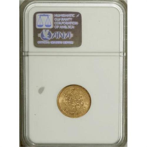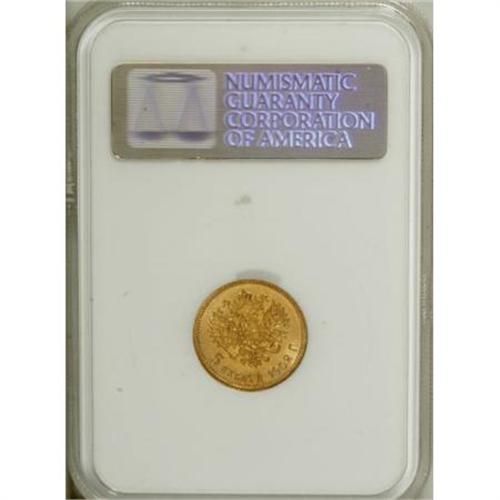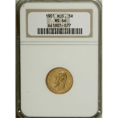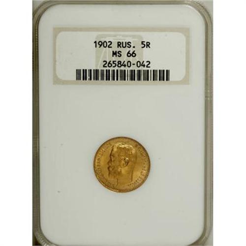 <B>A pair of Nicholas II gold 5 Roubles including:</B></I> 1901, MS66 NGC; and 1902 MS66 NGC. <BR><BR><b>Shipping:</b> Coins & Currency (<a target="_blank" href="http://www.heritageauctions.com/common/shipping.php">view shipping information</a>)