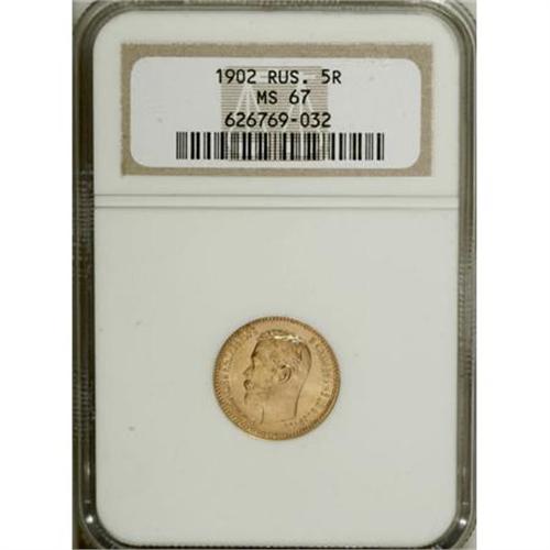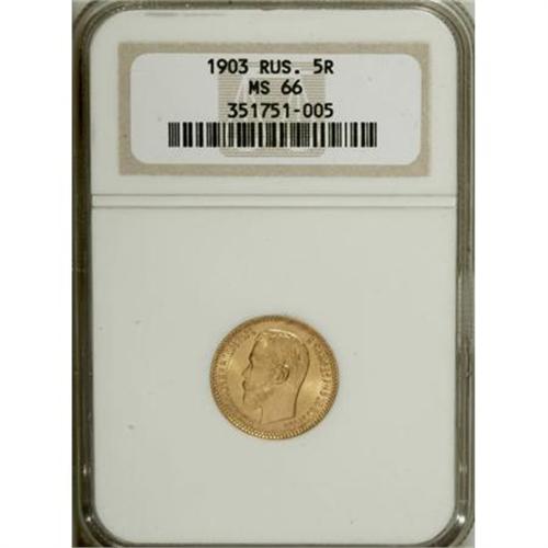 <B>A pair of Nicholas II gold 5 Roubles</B></I> <B>including:</B></I> 1902, MS67 NGC; and 1903 MS66 NGC. <BR><BR><b>Shipping:</b> Coins & Currency (<a target="_blank" href="http://www.heritageauctions.com/common/shipping.php">view shipping information</a>)