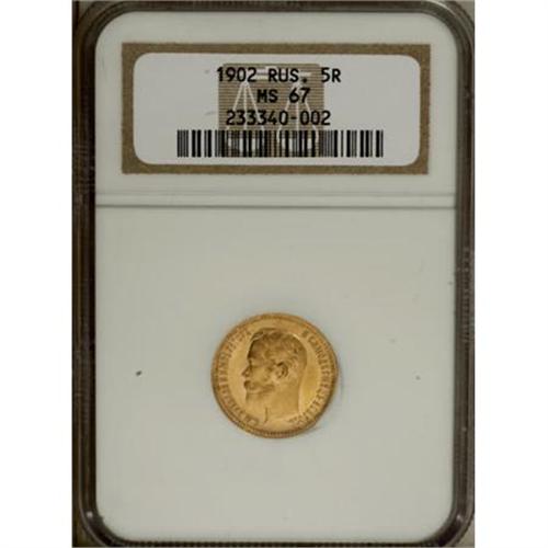 <B>A trio of Nicholas II gold 5 Roubles including</B></I>: (3) 1902, MS67 NGC.<BR><BR><b>Shipping:</b> Coins & Currency (<a target="_blank" href="http://www.heritageauctions.com/common/shipping.php">view shipping information</a>)