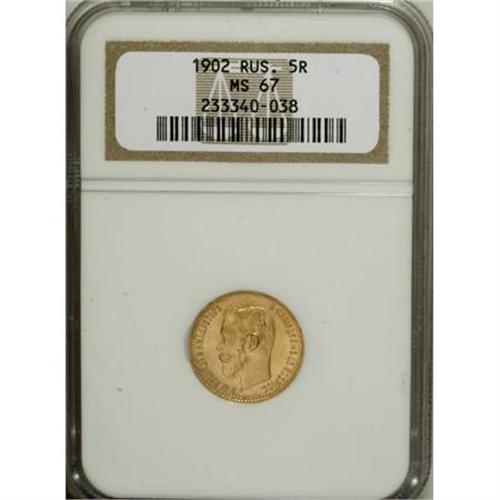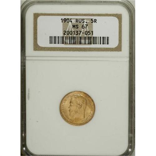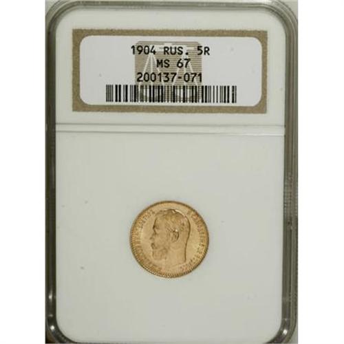 <B>A trio of Nicholas II gold 5 Roubles including</B></I>: 1902 and (2) 1904, all MS67 NGC.<BR><BR><b>Shipping:</b> Coins & Currency (<a target="_blank" href="http://www.heritageauctions.com/common/shipping.php">view shipping information</a>)