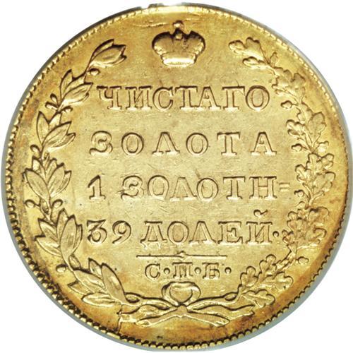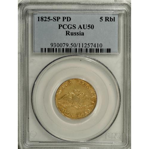 <B>Alexander I. Gold 5 Roubles 1825 C??-??,</B></I> Imperial eagle with wings down/Crowned inscription in wreath, Bit-25, F-150, AU50 PCGS. Greenish-gold patina with light marks and luster remaining. A very scarce type.<BR><BR><b>Shipping:</b> Coins & Currency (<a target="_blank" href="http://www.heritageauctions.com/common/shipping.php">view shipping information</a>)