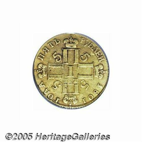 <B>Alexander I Gold 5 Rubles 1801-CM,</B></I> Fr-144, KM-C104.1, XF40 PCGS. Wavy planchet with numerous abrasions on both sides.