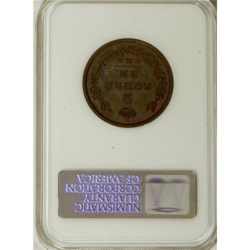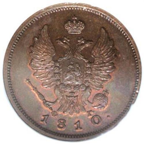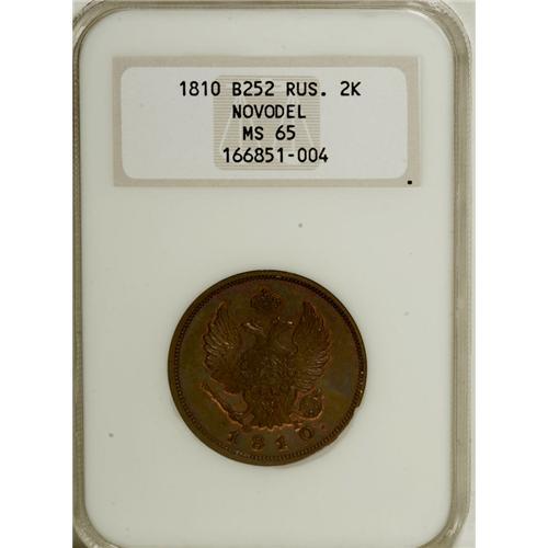 <B>Alexander I. Novodel 2 Kopecks 1810 C??-??,</B></I> Crowned Imperial eagle with date below/Crowned value within wreath, Bit-H569 (R.2), Brekke-252, MS65 NGC. Well struck, with prooflike fields and traces of original mint red color around the devices.<BR><I>From the Belle Glade Collection, Part Two.</B></I><BR><BR><b>Shipping:</b> Coins & Currency (<a target="_blank" href="http://www.heritageauctions.com/common/shipping.php">view shipping information</a>)