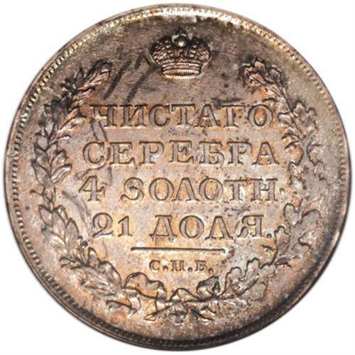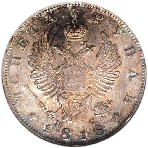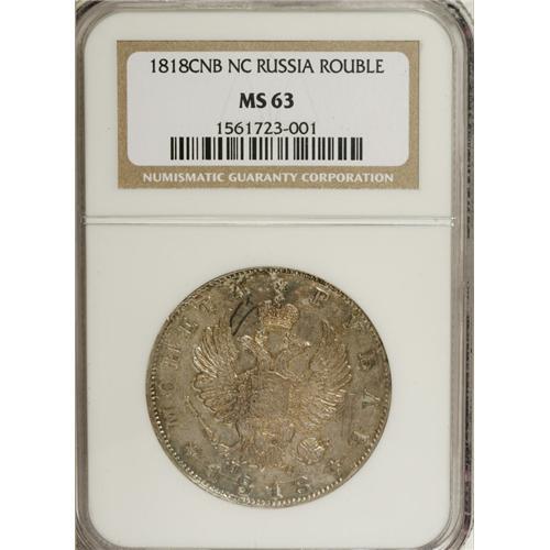 <B>Alexander I. Rouble 1818 C??-?C,</B></I> Crowned Imperial eagle/Crowned inscription in wreath, Bit-123, Uzd-1444, MS63 NGC. Superb, original gold and steel-gray toning over full luster. Collection, or museum markings number 17 in pencil on both sides of the coin.<BR><BR><b>Shipping:</b> Coins & Currency (<a target="_blank" href="http://www.heritageauctions.com/common/shipping.php">view shipping information</a>)