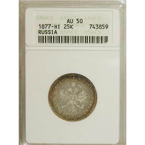 <B>Alexander II. 25 Kopecks 1877 C??-HI,</B></I> Imperial eagle/ Date and value in wreath, Bit-154, AU50 ANACS. Moderately abraded and lustrous with russet peripheral toning on both sides. <BR><BR><b>Shipping:</b> Coins & Currency (<a target="_blank" href="http://www.heritageauctions.com/common/shipping.php">view shipping information</a>)