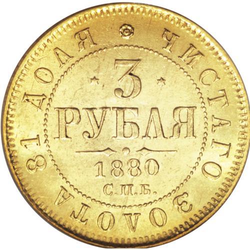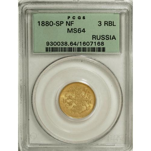 <B>Alexander II. Gold 3 Roubles 1880 C??-H?,</B></I> Crowned Imperial eagle/Date and value in circle, Bit-43 (R), F-164, MS64 PCGS. Well struck with bright golden luster and only minor imperfections Rare in this condition.<BR><I>From the Belle Glade Collection, Part Two.</B></I><BR><BR><b>Shipping:</b> Coins & Currency (<a target="_blank" href="http://www.heritageauctions.com/common/shipping.php">view shipping information</a>)