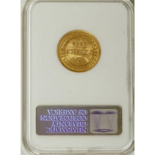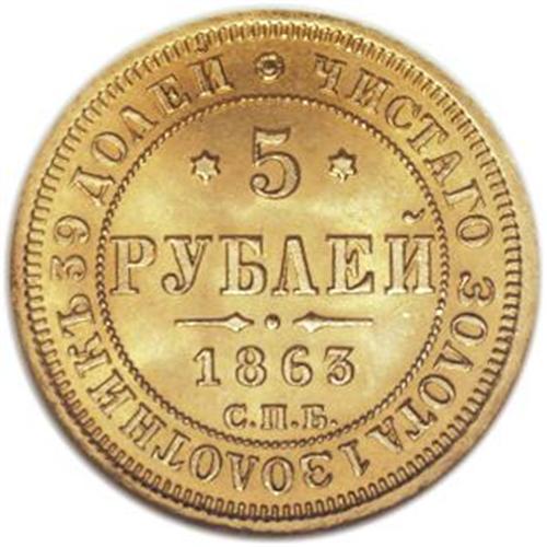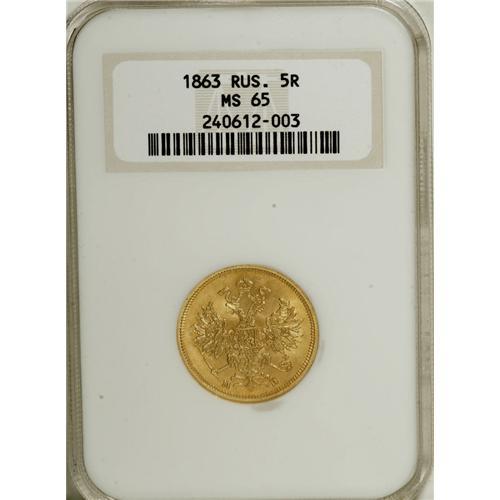 <B>Alexander II. Gold 5 Roubles 1863 C??-M?,</B></I> Crowned Imperial eagle/Date and value in circle, Bit-9, F-163, MS65 NGC. A Gem Mint State example with well struck satin surfaces and bright green-gold luster.<BR><I>From the Belle Glade Collection, Part Two.</B></I><BR><BR><b>Shipping:</b> Coins & Currency (<a target="_blank" href="http://www.heritageauctions.com/common/shipping.php">view shipping information</a>)