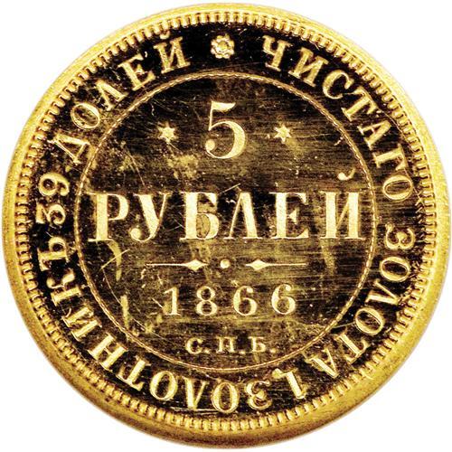 <B>Alexander II. Gold 5 Roubles 1866 C??-CIII,</B></I> Crowned Imperial eagle/Date and value in circle, Bit-13 (R.1), F-163, Proof 66 NGC. Brilliant golden color with bold definition and no noticeable flaws. A very rare issue in pristine condition. Extremely rare as a Proof.<BR><I>From the Belle Glade Collection, Part Two.</B></I><BR><BR><b>Shipping:</b> Coins & Currency (<a target="_blank" href="http://www.heritageauctions.com/common/shipping.php">view shipping information</a>)