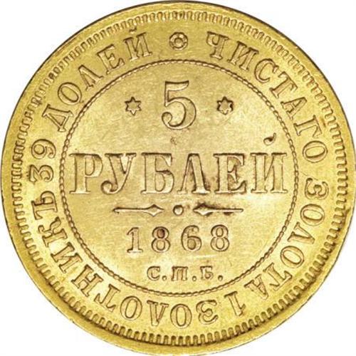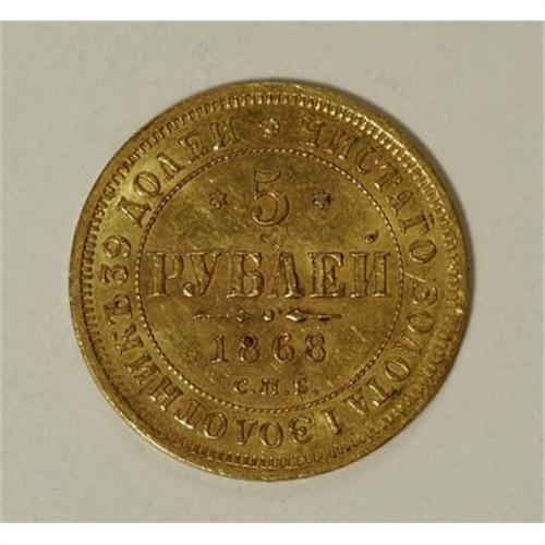 <B>Alexander II. Gold 5 Roubles 1868 C??-HI,</B></I> Imperial eagle/Date and value in wreath, Bit-16, AU. Well struck and lustrous. <BR><BR><b>Shipping:</b> Coins & Currency (<a target="_blank" href="http://www.heritageauctions.com/common/shipping.php">view shipping information</a>)
