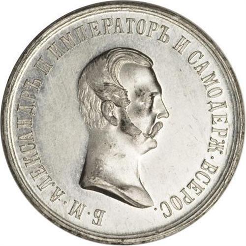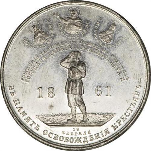 <B>Alexander II, Iverson Memorial Medal in white metal 1861,</B></I> Bust of Alexander right/Peasant with three Saints above, Diakov-702.4, (unlisted in white metal), 35 mm, Choice AU. <BR><BR><b>Shipping:</b> Coins & Currency (<a target="_blank" href="http://www.heritageauctions.com/common/shipping.php">view shipping information</a>)