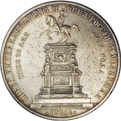 <B>Alexander II. Nicholas I Commemorative Rouble 1859,</B></I> by Lyalin, Bust left/Nicholas I monument, Bit-567, Uzd-4194, cleaned VF with noticeable contact marks.<BR><BR><b>Shipping:</b> Coins & Currency (<a target="_blank" href="http://www.heritageauctions.com/common/shipping.php">view shipping information</a>)
