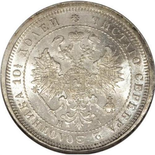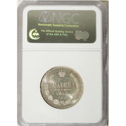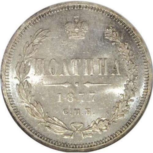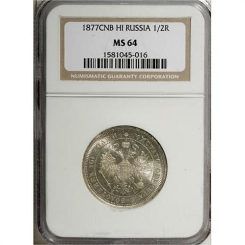 <B>Alexander II. Poltina 1877 C??-HI,</B></I> Imperial eagle/ Date and value in wreath, Bit-125, MS64 NGC. Brilliant white with full, frosty mint luster. <BR><BR><b>Shipping:</b> Coins & Currency (<a target="_blank" href="http://www.heritageauctions.com/common/shipping.php">view shipping information</a>)