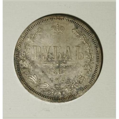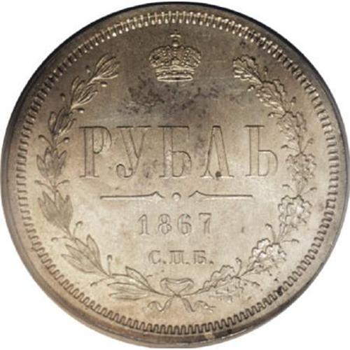<B>Alexander II. Rouble 1867 C??-HI, </B></I><BR> Imperial eagle/Date and value in wreath, Bit-80, UNC details Stained NCS. Sharply struck with full luster beneath some type of old staining from improper storage. <BR><BR><b>Shipping:</b> Coins & Currency (<a target="_blank" href="http://www.heritageauctions.com/common/shipping.php">view shipping information</a>)