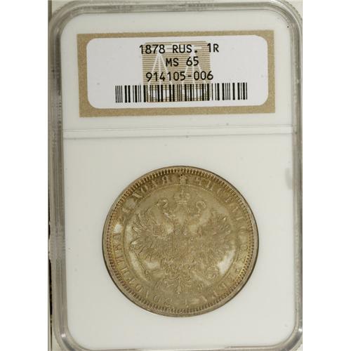 <B>Alexander II. Rouble 1878 C??-H?,</B></I> Crowned Imperial eagle/Date and value in wreath, Bit-92, Uzd-1933, MS65 NGC. Glistening luster beneath attractive sea-green toning with a full strike and no significant flaws.<BR><I>From the Belle Glade Collection, Part Two.</B></I><BR><BR><b>Shipping:</b> Coins & Currency (<a target="_blank" href="http://www.heritageauctions.com/common/shipping.php">view shipping information</a>)