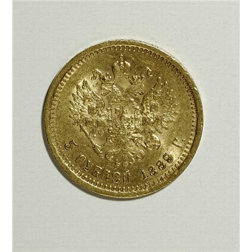 <B>Alexander III. Gold 5 Roubles 1889 A?,</B></I> Bust right/Imperial eagle with date and value, Bit-33, F-168, lustrous XF. <BR><BR><b>Shipping:</b> Coins & Currency (<a target="_blank" href="http://www.heritageauctions.com/common/shipping.php">view shipping information</a>)