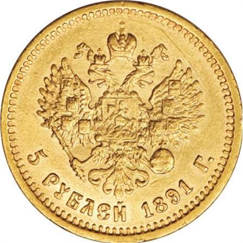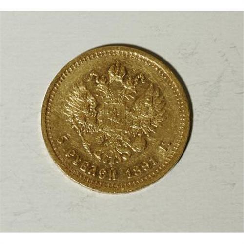 <B>Alexander III. Gold 5 Roubles 1891 A?, </B></I> Bust right/Imperial eagle with date and value, Bit-36, XF. A second example in virtually identical condition. <BR><BR><b>Shipping:</b> Coins & Currency (<a target="_blank" href="http://www.heritageauctions.com/common/shipping.php">view shipping information</a>)