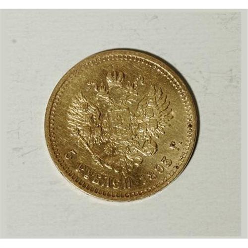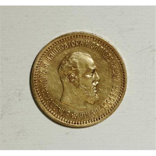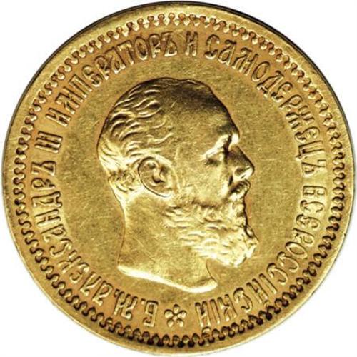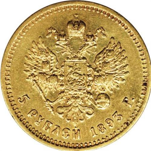 <B>Alexander III. Gold 5 Roubles 1893 A?, </B></I> Bust right/Imperial eagle with date and value, Bit-39, XF. Evenly worn with a bit of luster remaining. A scarcer issue. <BR><BR><b>Shipping:</b> Coins & Currency (<a target="_blank" href="http://www.heritageauctions.com/common/shipping.php">view shipping information</a>)
