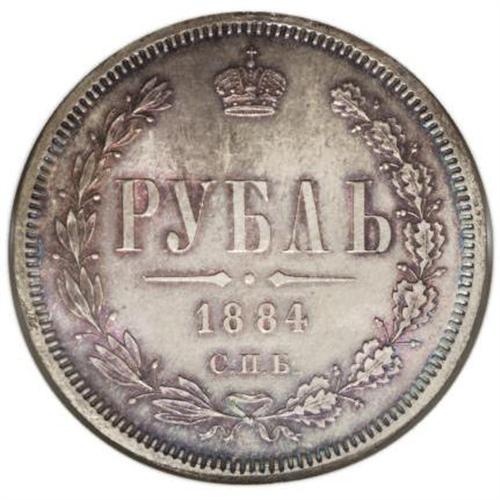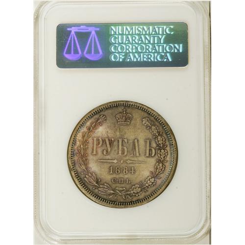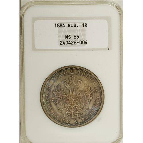 <B>Alexander III. Rouble 1884 C??-A?,</B></I> Bust right/Crowned Imperial eagle with date and value, Bit-45, Uzd-1987, MS65 NGC. Soft reddish-blue toning over well struck satin surfaces with no significant imperfections. <BR><I>From the Belle Glade Collection, Part Two.</B></I><BR><BR><b>Shipping:</b> Coins & Currency (<a target="_blank" href="http://www.heritageauctions.com/common/shipping.php">view shipping information</a>)