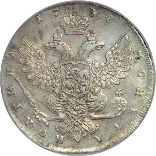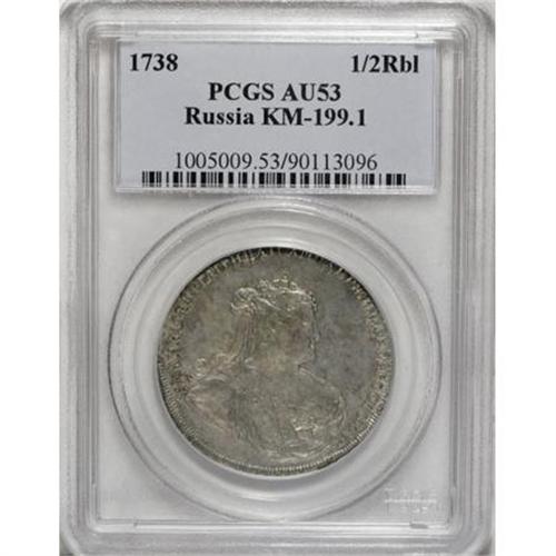 <B>Anna. Poltina (1/2 Rouble) 1738</B></I>, St. Petersburg Mint with no mint letters, Bust right/Imperial eagle with date, Bit-243 (R), AU53 PCGS. Lustrous with light gray patina. A rare one-year type without the mint letters. Super eye-appeal for this very rare early issue. The early Poltinas in choice condition seem to be much scarcer than the Roubles.<BR><BR><b>Shipping:</b> Coins & Currency (<a target="_blank" href="http://www.heritageauctions.com/common/shipping.php">view shipping information</a>)