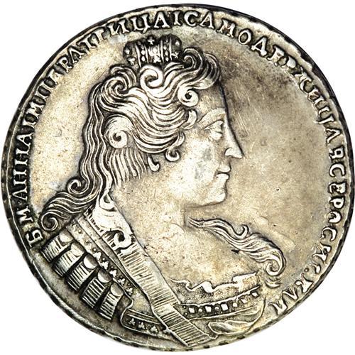 <B>Anna. Rouble 1733,</B></I> Crowned bust right/Imperial eagle, Bit-65, KM192.2, Dav-1671, XF. Sharply struck with iridescent surfaces and traces of original luster remaining. <BR><BR><b>Shipping:</b> Coins & Currency (<a target="_blank" href="http://www.heritageauctions.com/common/shipping.php">view shipping information</a>)