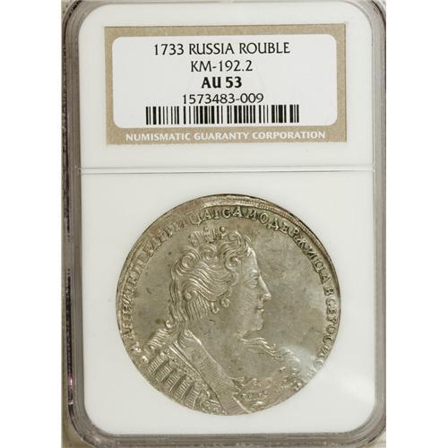 <B>Anna. Rouble 1733,</B></I> Crowned bust right/Imperial eagle, Bit-67, KM192.2, Dav-1671, AU53 NGC. Boldly struck with slightly mottled patina, minor flan flaws, and considerable remaining luster.<BR><BR><b>Shipping:</b> Coins & Currency (<a target="_blank" href="http://www.heritageauctions.com/common/shipping.php">view shipping information</a>)