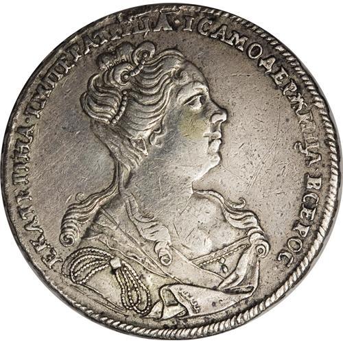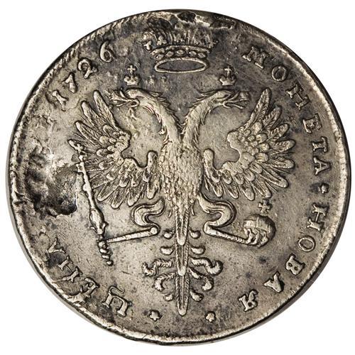 <B>Catherine I. Rouble 1726, Moscow,</B></I> Bust Right/Imperial eagle, Bit-45, KM177.1, Dav-1665, XF details. Cleaned, with a mount removed at 12 o'clock and a large reverse flaw at 9 o'clock.<BR><BR><b>Shipping:</b> Coins & Currency (<a target="_blank" href="http://www.heritageauctions.com/common/shipping.php">view shipping information</a>)