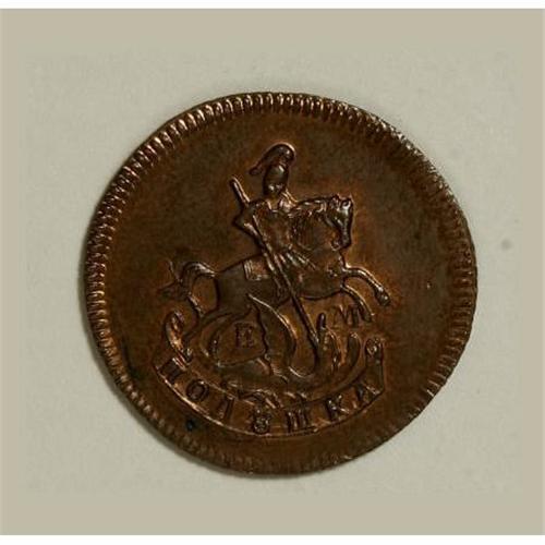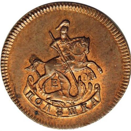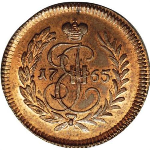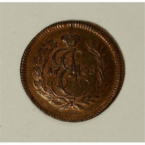 <B>Catherine II. Novodel Polushka (1/4 Kopeck) 1765 E?,</B></I> Bit-H765 (R2), Choice UNC with considerable mint red color remaining. <BR><BR><b>Shipping:</b> Coins & Currency (<a target="_blank" href="http://www.heritageauctions.com/common/shipping.php">view shipping information</a>)