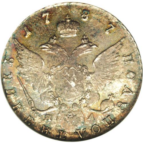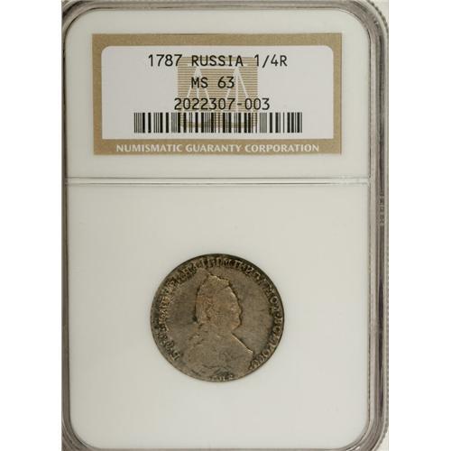 <B>Catherine II. Polupoltinnik (1/4 Rouble) 1787 C??-?A,</B></I> Crowned bust right/Crowned Imperial eagle with date above, Bit-343, Uzd-1173, MS63 NGC. Light gold and gray toning with full underlying luster. Very scarce in this original Mint condition.<BR><I>From the Belle Glade Collection, Part Two.</B></I><BR><BR><b>Shipping:</b> Coins & Currency (<a target="_blank" href="http://www.heritageauctions.com/common/shipping.php">view shipping information</a>)