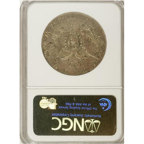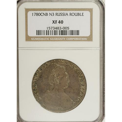 <B>Catherine II. Rouble 1780 C??-??,</B></I> Crowned bust right/Imperial eagle, Bit-228, Uzd-1104, XF40 NGC. Softly struck with a few light contact marks.<BR><BR><b>Shipping:</b> Coins & Currency (<a target="_blank" href="http://www.heritageauctions.com/common/shipping.php">view shipping information</a>)