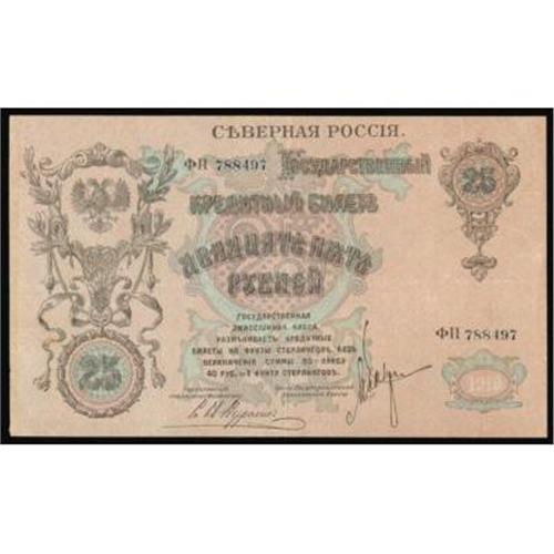 <style type="text/css"> body, td, th { font-family: Arial, Helvetica, sans-serif; font-size: 12px; color: #482424; margin: 0px; padding: 0px; } #header { background-image: url(http://www.bowersandmerena.com/ebay/images/template_v3_01.gif); clear: both; background-color: #590303; border-top-width: 2px; border-top-style: solid; border-top-color: #B38C4F; } #header #header_wrapper { height: 75px; clear: both; width: 800px; margin-right: auto; margin-left: auto; background-image: url(http://www.bowersandmerena.com/ebay/images/template_v3_03.gif); background-repeat: no-repeat; background-position: right; color: #F3EDCC; } #header #header_wrapper #header_logo { float: left; height: 75px; width: 444px; background-image: url(http://www.bowersandmerena.com/ebay/images/template_v3_02.gif); background-repeat: no-repeat; font-size: 10px; text-transform: capitalize; color: #B38C4F; } #header #header_wrapper #header_right { float: left; height: 75px; width: 356px; text-align: right; } #header #header_wrapper #header_right #headerLoginBtn { margin-bottom: 30px; } #header #header_wrapper #header_right input#txtSearch { color: #B49056; border: 1px solid #B49056; width: 175px; padding-top: 3px; padding-right: 3px; padding-bottom: 4px; padding-left: 3px; } #nav { height: 37px; background-image: url(http://www.bowersandmerena.com/ebay/images/template_v3_05.gif); clear: both; } #nav #nav_wrapper { height: 35px; width: 800px; margin-right: auto; margin-left: auto; border-left-width: 1px; border-left-style: solid; border-left-color: #B38C4F; } #nav #nav_wrapper a { padding-right: 15px; padding-left: 15px; border-right-width: 1px; border-right-style: solid; border-right-color: #B38C4F; height: 25px; padding-top: 10px; display: block; float: left; text-decoration: none; font-weight: bold; color: #5D0303; } #nav #nav_wrapper a:hover { color: #B38C4F; } #nav #nav_wrapper #search { float: right; padding-top: 7px; } #nav #nav_wrapper #search #txtSearch { font-family: Arial, Helvetica, sans-serif; font-size: 10px; text-transform: uppercase; color: #D2AE75; border: 1px solid #B38C4F; padding: 3px; } #content_bgd { background-image: url(http://www.bowersandmerena.com/ebay/images/template_v3_09.gif); background-repeat: repeat-y; background-position: center; padding-top: 15px; padding-bottom: 15px; background-color: #FBFBDB; } #content_wrapper { clear: both; height: auto; width: 800px; margin-right: auto; margin-left: auto; } .LotDetailWhite { line-height:normal; font-size:13px; font-family: arial,helvetica,sans-serif; color: White; font-weight: bold; } .LotDetailInformation { line-height:normal; font-size: 13px; font-family: arial,helvetica,sans-serif; } .LotDetailMessage { line-height:normal; font-size: 13px; font-family: arial,helvetica,sans-serif; color: red; } } tr.HeaderAuctionTitle td { color: #000000; font-weight: bold; padding: 2px; background-image: url(http://www.bowersandmerena.com/ebay/images/template_v3_05.gif); background-repeat: repeat-x; border-bottom-width: 1px; border-bottom-style: solid; border-bottom-color: #B38C4F; } table.AuctionSummary a, table.AuctionSummary a:link, table.AuctionSummary a:visited { color: #0000FF; text-decoration: none; } } td.tableHeaderLeft { border-left-width: 1px; border-left-style: solid; border-left-color: #B38C4F; } td.tableHeaderRight { border-right-width: 1px; border-right-style: solid; border-right-color: #B38C4F; } td.tableCellMiddle { border-left-width: 1px; border-left-style: solid; border-left-color: #B38C4F; border-right-width: 1px; border-right-style: solid; border-right-color: #B38C4F; padding: 5px; } tr.footer td { border-top-width: 1px; border-top-style: solid; border-top-color: #B38C4F; } </style> </head> <body> <div id="header"> <div id="header_wrapper"> <div id="header_logo"> </div> <div id="header_right"> </div> </div> </div> <div id="nav"> <div id="nav_wrapper"> <a href="http://www.bowersandmerena.com">Our eBayLive Auctions</a> <a href="#PaymentInfo">Payment Information</a> <a href="#ShippingInfo">Shipping Information</a> <a href="#About">About Bowers and Merena</a> </div> </div> <div id="content_bgd"> <div id="content_wrapper"> <table width="100%" border="0" cellpadding="5" cellspacing="0" class="AuctionSummary"> <tbody> <tr class="HeaderAuctionTitle" style="height: 25px;"> <td align="left" class="tableHeaderLeft" > </td> <td align="center" class="tableHeaderRight"> <span style="font-size: large;">Lot #2004. North Russia. Chaikovskii Government, 1918 First Issue. </span> </td> </tr> <tr> <td colspan="3" class="tableCellMiddle"> 1918, 25 Rubles, P-S137, Pink and green, XF+ to almost AU condition with hinge marks on back right margin.